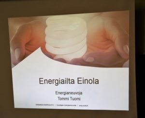 Äskettäin vietettiin energiailtaa Toimintakeskus Einolassa. Kymenlaakson energianeuvoja Tommi Tuomi kertoi kotitalouden energiansäästövinkkejä ammattilaisen näkökulmasta sekä esitteli erilaisia vaihtoehtoja kodin energiatuotantoon. Illan kuulijat olivat kiinnostuneita mm. aurinkoenergiasta sekä maalämmöstä. Vanhan lämmitysjärjestelmän vaihtaminen nykyaikaiseen järjestelmään herätti myöskin keskustelua. Tuomi totesikin, että toimivaa järjestelmää ei kannata lähteä vaihtamaan vaan miettiä uutta järjestelmää vasta vanhan hajotessa.