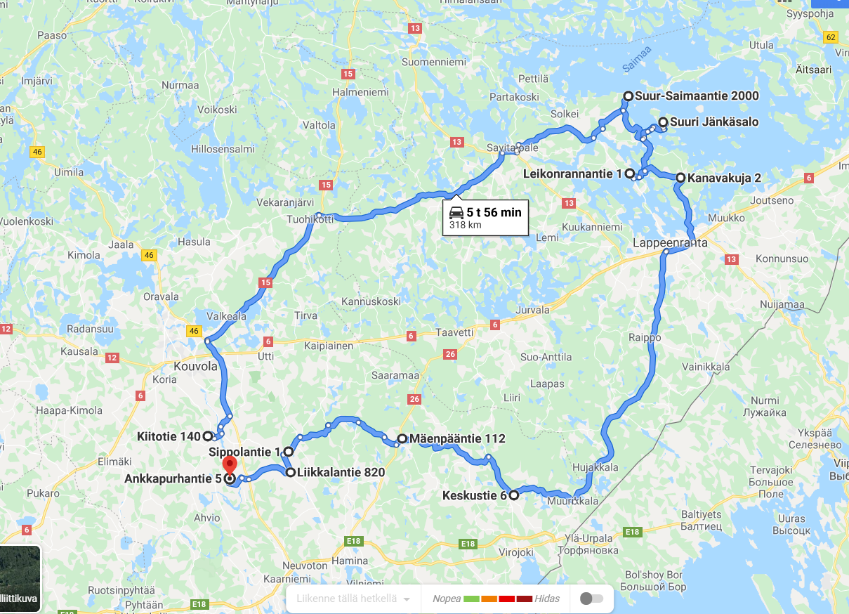 Reitti kiertää Kouvolasta Taipalsaarelle ja siellä juuri avattua pyöräilyreittiä hipoen lossilla suureen Jänkäsaareen omatoimisuudestaan kuuluisaan kylään. Sieltä Röytyn kotiseututalolle ja Vehkataipaleen kautta Miehikkälään. Loppumatkasta retkikunta tapaa ikäihmisten etäjumppaohjaajan Pyhällössä, Kartanonrouva von Daehnin Sippolassa, Liikkalan myllyn myllärin ja Anjalassa luontopolun, lääninkivet ja juoksuhaudat.