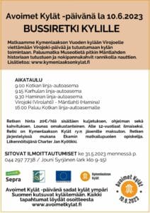 HUOM! Bussi on täyteenbuukattu. Avoimet Kylät -päivän tapahtumissa voi vierailla myös omatoimisesti. Kaikki kylät ja kohteet julkaistaan kesäkuun alussa www.avoimetkylat.fi –sivustolla.
