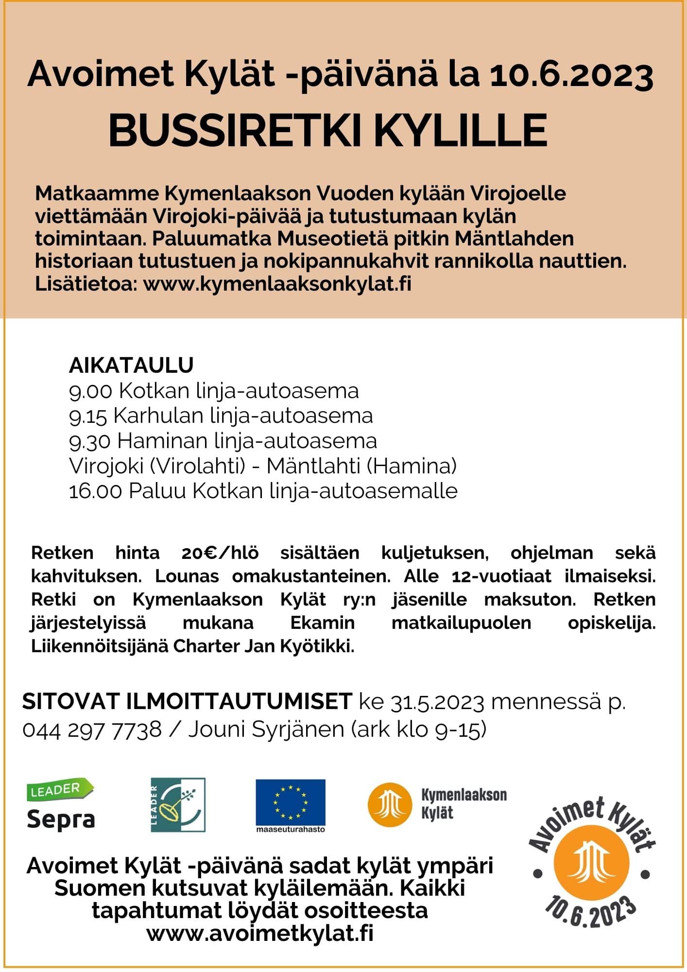 Retken hinta 20€/hlö sisältäen kuljetuksen, ohjelman sekä kahvituksen. Lounas omakustanteinen. Alle 12-vuotiaat ilmaiseksi. Retki on Kymenlaakson Kylät ry:n jäsenille maksuton. Retken järjestelyissä mukana Ekamin matkailupuolen opiskelija. Liikennöitsijänä Charter Jan Kyötikki.