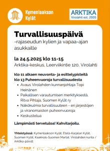 Tervetuloa Turvallisuuspäivään Virolahdelle lauantaina 24. toukokuuta klo 11–15! Tapahtuma järjestetään Arktika-keskuksessa (Leerviikintie 120) osana Virolahden Arktika-päiviä. Päivän aikana syvennytään kylien ja vapaa-ajan asukkaiden arjen turvallisuuteen sekä paikalliseen varautumiseen raja- ja merialueella.